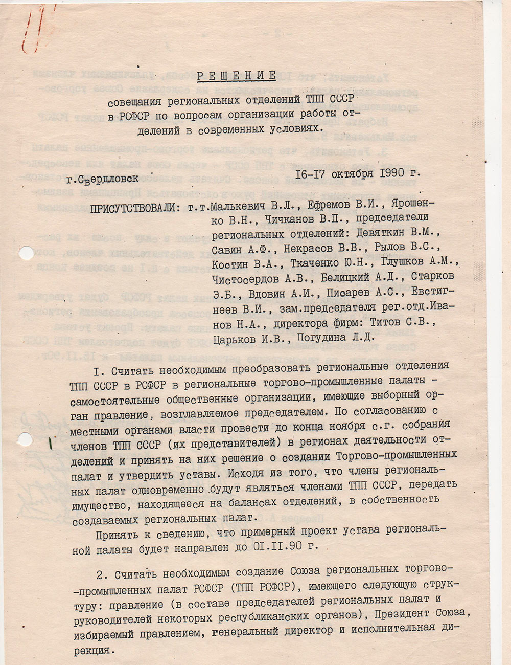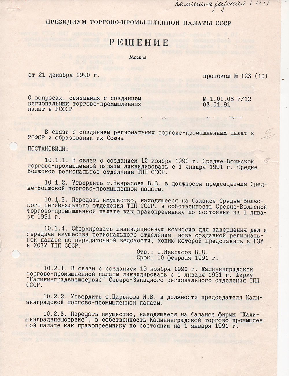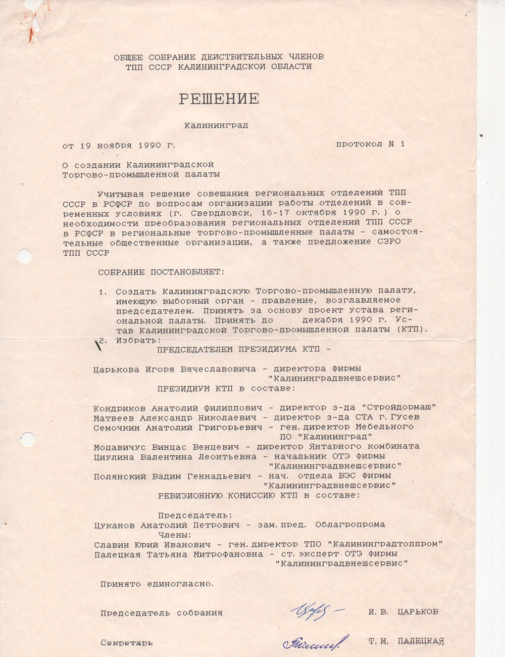 19 ноября 1990 года 39 действующих членов ТПП СССР Калининградской области приняли решение о создании регионального бизнес-объединения.